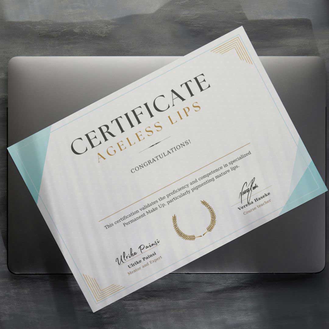 The Ageless Lips Masterclass Certificate of attendance is proof of your acquired knowledge and skills in the demanding art of lip pigmentation. It confirms that you have successfully mastered the latest techniques and methods for rejuvenating and enhancing lips.